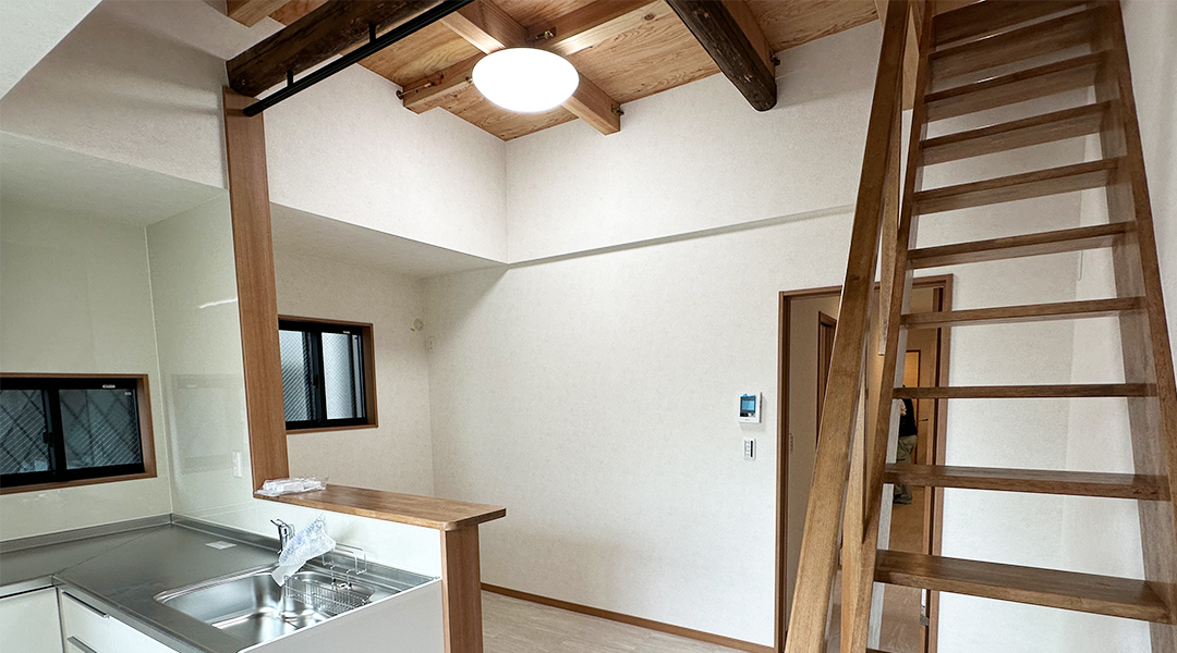 さらに梁見せ天井とすることで、家の歴史も感じられる施工です。